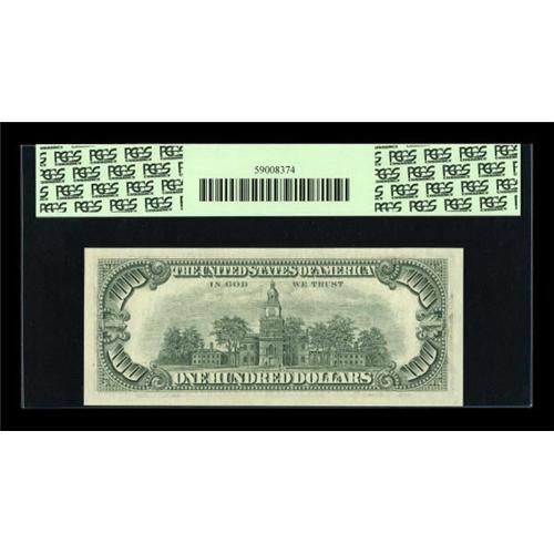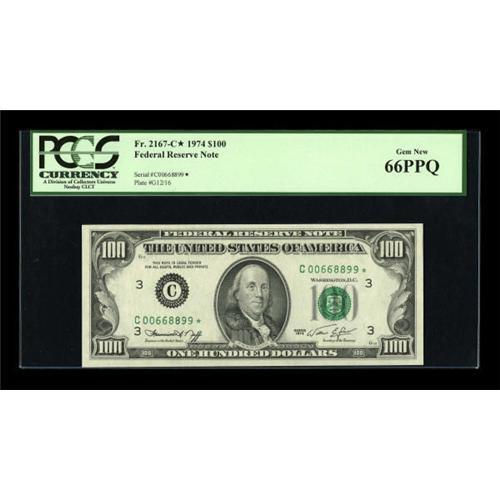 <B>Fr. 2167-C* $100 1974 Federal Reserve Note. PCGS Gem New 66PPQ.</B></I><BR> A very scarce late date star, with only 128,000 examples printed from this district. Few are likely to be as nice as this PCGS Gem New 66 PPQ specimen.<BR><I>From The Thomas M. Flynn Collection</B></I><BR><BR><b>Shipping:</b> Coins & Currency (<a target="_blank" href="http://www.heritageauctions.com/common/shipping.php">view shipping information</a>)