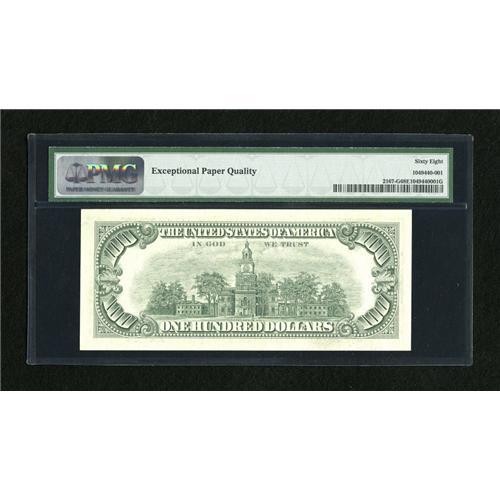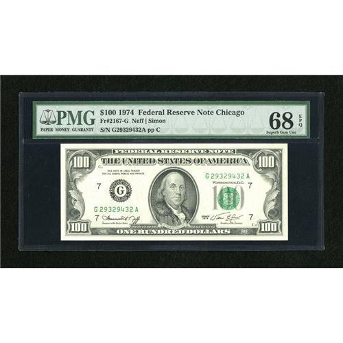 <B>Fr. 2167-G $100 1974 Federal Reserve Note. PMG Superb Gem Uncirculated 68 EPQ.</B></I><BR>Broadly margined paper is complemented by bold embossing.<BR><I>From The Bill and Kathy Stella Currency Collection</B></I><BR><BR><b>Shipping:</b> Coins & Currency (<a target="_blank" href="http://www.heritageauctions.com/common/shipping.php">view shipping information</a>)