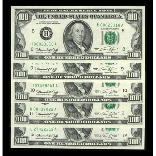 <B>Fr. 2167-H; I; J; K; L $100 1974 Federal Reserve Notes. Choice Crisp Uncirculated or Better.</B></I><BR> This lot contains five C-notes from different districts from the 1974 Series. A couple of the notes have enough centering to qualify for gem status.<BR><I>From The Thomas M. Flynn Collection</B></I><BR><BR><b>Shipping:</b> Coins & Currency (<a target="_blank" href="http://www.heritageauctions.com/common/shipping.php">view shipping information</a>)