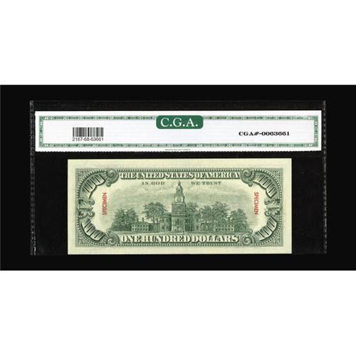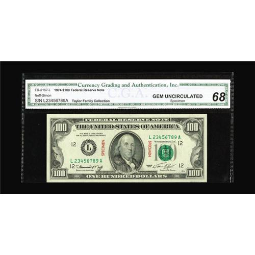 <B>Fr. 2167-L $100 1974 Specimen Federal Reserve Note. CGA Gem Uncirculated 68.</B></I><BR>This is a most pleasing piece with the ladder serial number A23456789A and the added impression "SPECIMEN" appearing in bold red on the face twice and twice on the back. This note previously appeared in our Taylor Family Collection Auction where it realized nearly $5,000.