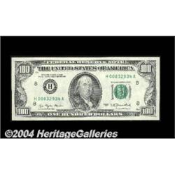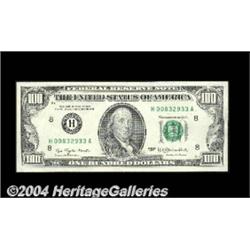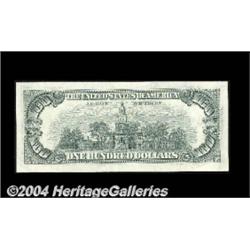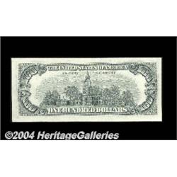Fr. 2168-H $100 1977 Federal Reserve Notes. Gem Crisp Uncirculated. A nice set of three pieces, the two bookends perfect and the middle note with a blank reverse. This is a key denomination to any set of blank reverse notes, and this trio makes an attractive display item. 3 notes <BR><BR><B>Important notice:</B> Heritage usually auctions material at the rate of 200-250 lots per hour. On some occasions eBay Live bid software or the Internet may not be able to keep up with the pace of the auction. We recommend placing a realistic absentee bid now as insurance to avoid disappointment. Occasionally the auctioneer may eliminate or reject an eBay Live bid, and the auctioneer may also reopen a lot after the close of the eBay live bidding (usually because we missed an audience bid), and may reject your bid even if it shows you as the winning bidder. By bidding via eBay Live, you agree that Heritage may award the lot to another bidder at its sole discretion under the circumstances described above or any other reasonable circumstances. Since eBay bids are not shown to us until we open the lot on the floor, we treat those bids just like floor bids. In most cases the floor responds before the eBay bid is presented to us, due to Internet lag time, so for consistency we have made it a policy that floor bids are always considered first over tie eBay live bids. Also please note that all Heritage lots purchased through eBay Live carry a 20% Buyer's Premium. Please make sure you read the Terms and Conditions before you bid. <BR><BR><B>IMPORTANT ANNOUNCEMENT ABOUT RESERVES:</B> Heritage now divulges all reserves on its web site 7 days before every auction. If you want to know whether the reserve on this lot has been met, and if not, what the reserve amount is, please visit this lot page on the HeritageCoin.com web site, or email: bid@HeritageGalleries.com