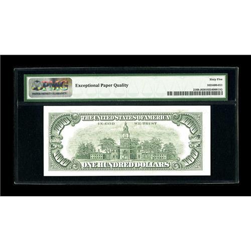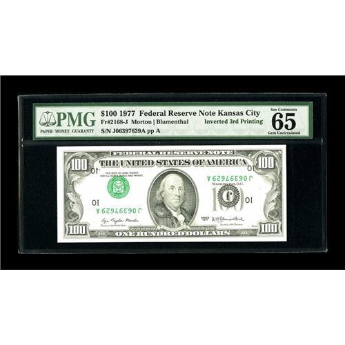 <B>Fr. 2168-J $100 1977 Federal Reserve Note. PMG Gem Uncirculated 65 EPQ.</B></I><BR>Simply a gorgeous example of this eye-popping error that is bright and well margined.<BR><BR><b>Shipping:</b> Coin/Currency (<a target="_blank" href="http://www.heritageauctions.com/common/shipping.php">view shipping information</a>)