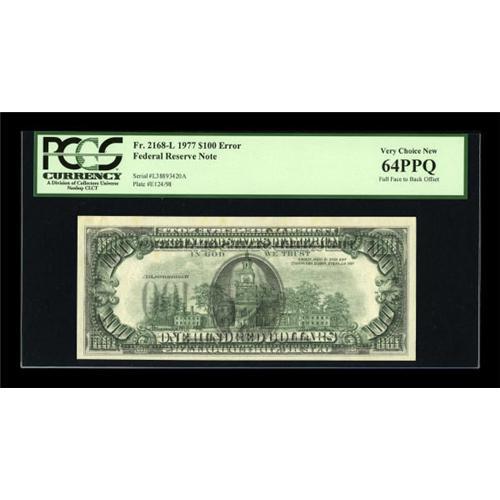 <B>Fr. 2168-L $100 1977 Federal Reserve Note. PCGS Very Choice New 64PPQ.</B></I><BR> This San Francisco $100 strikes a dark 100% face to back offset pose.<BR><I>From The Walla Walla Collection</B></I><BR><BR><b>Shipping:</b> Coins & Currency (<a target="_blank" href="http://www.heritageauctions.com/common/shipping.php">view shipping information</a>)