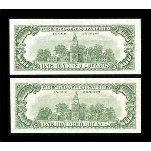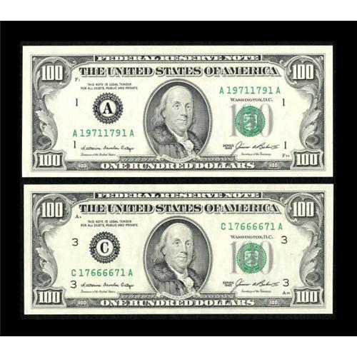<B>Fr. 2171-A; C $100 1985 Federal Reserve "Radar" Notes. Choice Crisp Uncirculated or Better.</B></I><BR> This lot consists of two attractive "radar" notes from the $100 denomination which is rather unusual. The numbers are 19711791 and 17666671. This is an opportunity to spice up your "radar" collection with a couple of high denomination examples.<BR><I>From The Thomas M. Flynn Collection</B></I><BR><BR><b>Shipping:</b> Coins & Currency (<a target="_blank" href="http://www.heritageauctions.com/common/shipping.php">view shipping information</a>)