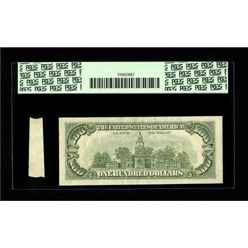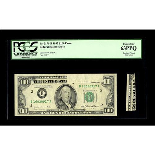 <B>Fr. 2171-B $100 1985 Federal Reserve Note. PCGS Choice New 63PPQ.</B></I><BR>Here is cute error that doesn't turn up with regularity especially on the $100 denomination as most printed scrap pieces usually fell off from the constant handling of the printed sheets. Well margined and with plenty of original embossing in place, we are very fortunate an astute bank teller put this away long ago and kept the paper fragment. This error carries a rarity rating of nine. Neither Dr. Frederick J. Bart's Paper Money Error book or Stephen M. Sullivan's US Error Note Encyclopedia make mention nor have a picture of a retained obstruction on a C-note. Expect a battle this evening to take this prize home.<BR><BR><b>Shipping:</b> Coin/Currency (<a target="_blank" href="http://www.heritageauctions.com/common/shipping.php">view shipping information</a>)