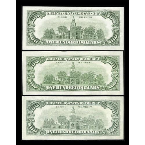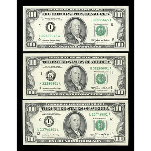 <B>Fr. 2171-I; K; L $100 1985 Federal Reserve Notes. Gem Crisp Uncirculated.</B></I><BR> This trio is broadly margined.<BR><I>From The Thomas M. Flynn Collection</B></I><BR><BR><b>Shipping:</b> Coins & Currency (<a target="_blank" href="http://www.heritageauctions.com/common/shipping.php">view shipping information</a>)