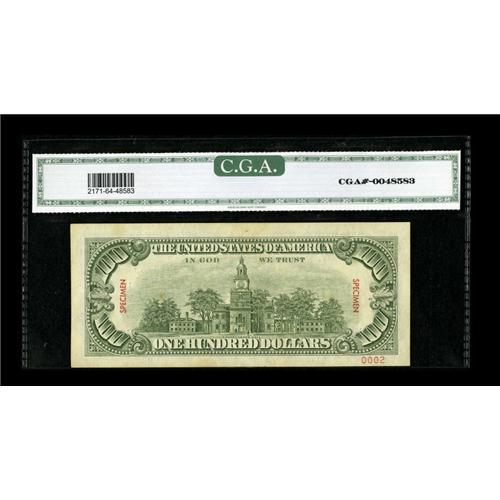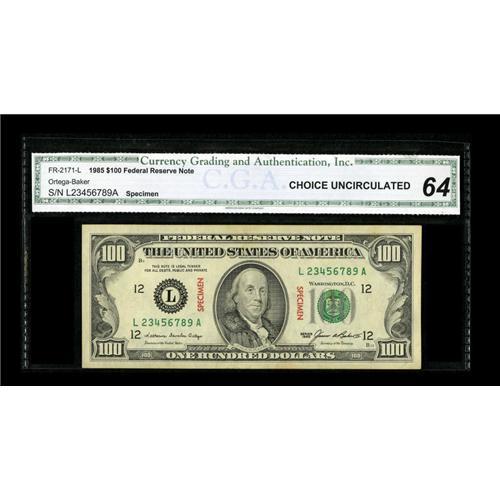<B>Fr. 2171-L $100 1985 Federal Reserve Note. CGA Choice Uncirculated 64.</B></I><BR>This note originally sold in our 2004 Long Beach sale where the description read, "A specimen which is overstamped twice with that word on each side and bears serial number L23456789A. We've had several lower denomination examples, but this is our first hundred. It's been slabbed by CGA and given the grade Choice Uncirculated 64."<BR><BR><b>Shipping:</b> Coins & Currency (<a target="_blank" href="http://www.heritageauctions.com/common/shipping.php">view shipping information</a>)