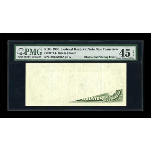 <B>Fr. 2171-L $100 1985 Federal Reserve Note. PMG Extremely Fine 45 EPQ.</B></I><BR> An obstruction has left only a sliver of the first printing on this denomination, which rarely displays errors of this magnitude.<BR><BR><b>Shipping:</b> Coins & Currency (<a target="_blank" href="http://www.heritageauctions.com/common/shipping.php">view shipping information</a>)