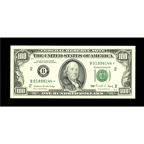 <B>Fr. 2172-B* $100 1988 Federal Reserve Note. Gem Crisp Uncirculated.</B></I><BR>Star notes were only printed for the Boston district and survivors are scarce today.<BR><BR><b>Shipping:</b> Coin/Currency (<a target="_blank" href="http://www.heritageauctions.com/common/shipping.php">view shipping information</a>)