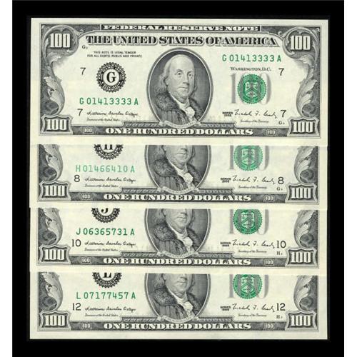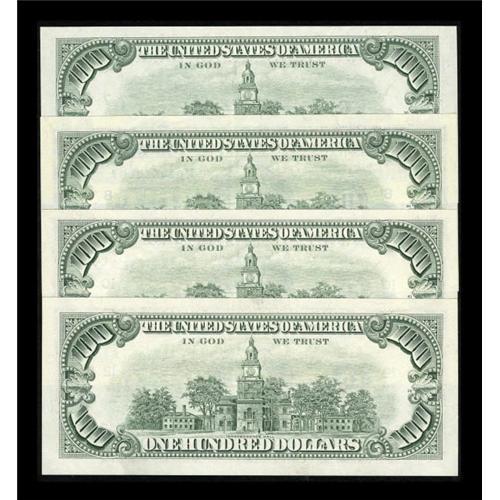 <B>Fr. 2172-G; H; J; L $100 1988 Federal Reserve Notes. Gem Crisp Uncirculated.</B></I><BR> These well preserved C-notes have broad margins.<BR><I>From The Thomas M. Flynn Collection</B></I><BR><BR><b>Shipping:</b> Coins & Currency (<a target="_blank" href="http://www.heritageauctions.com/common/shipping.php">view shipping information</a>)