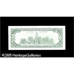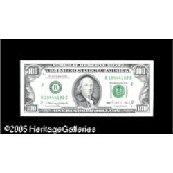 <B>Fr. 2173-B $100 1990 Federal Reserve Note. Very Fine.</B></I><BR>Green ink instead of black was used for the third printing overprint. This has proved to be a very scarce error, particularly in this denomination. Lot:15348
