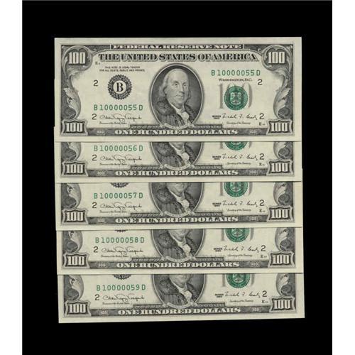 <B>Fr. 2173-B $100 1990 Federal Reserve Notes. Five Consecutive Examples. Gem Crisp Uncirculated.</B></I><BR>Interesting serial numbers 10000055-59 grace this fivesome.
