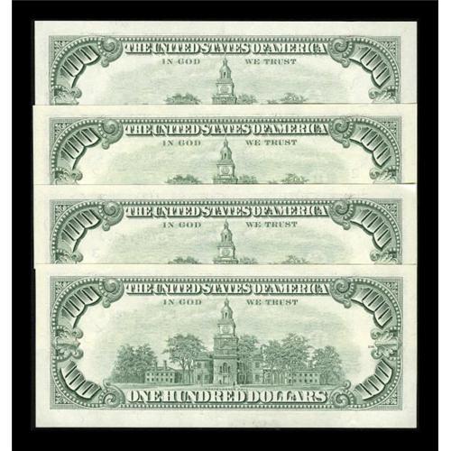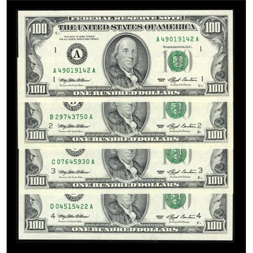 <B>Fr. 2174-A; B; C; D $100 1993 Federal Reserve Notes. About Uncirculated or Better.</B></I><BR> While the Cleveland note in this group does have a fold, the other three C-notes grade <B>Gem Crisp Uncirculated</B></I>.<BR><I>From The Thomas M. Flynn Collection</B></I><BR><BR><b>Shipping:</b> Coins & Currency (<a target="_blank" href="http://www.heritageauctions.com/common/shipping.php">view shipping information</a>)