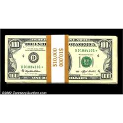 Fr. 2174-D* $100 1993 Federal Reserve Notes. Original Pack of 100. Gem Crisp Uncirculated.A pack of 100 stars, which were issued by only four districts in this transitional series which preceded the issuance of the "New Hundreds." The notes now catalogue for $200 each in Oakes, and, with an issue of only 1,200,000 pieces, might well be future rarities. The first note is a touch handled, as is the last, the other 98 are perfect gems. 100 notes Important notice: We expect to be auctioning lots at the rate of 200-250 per hour. Sometimes eBay Premier live bid software cannot keep up with that pace, so we strongly recommend that you place a realistic proxy bid now as insurance to avoid disappointment. Also please note that all Heritage/CAA lots purchased through eBay Premier carry a 20% Buyer's Premium. Please make sure you read the Terms and Conditions.