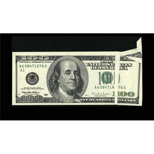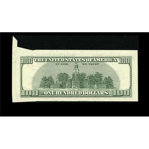 <B>Fr. 2175-A $100 1996 Federal Reserve Note. Crisp Uncirculated.</B></I> This gutter Hundred has two gutters on the face and an attached tab. The largest gutter is approximately 5mm wide and runs the entire length of this unusual error note.
