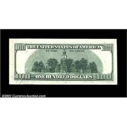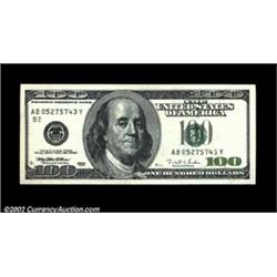 Fr. 2175-B $100 1996 Federal Reserve Note. Gem Crisp Uncirculated. A large gutter fold bisects virtually the entire note, a scarce error on the new hundreds. Important notice: We expect to be auctioning lots at the rate of 200-250 per hour. Sometimes eBay Premier live bid software cannot keep up with that pace, so we strongly recommend that you place a realistic proxy bid now as insurance to avoid disappointment. Also please note that all Heritage/CAA lots purchased through eBay Premier carry a 20% Buyer's Premium. Please make sure you read the Terms and Conditions.
