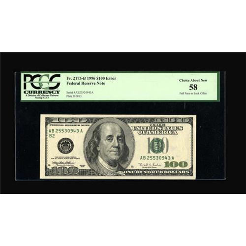 <B>Fr. 2175-B $100 1996 Federal Reserve Note. PCGS Choice About New 58.</B></I><BR> A tiny corner of this face to back offset is missing at upper right. A scarce denomination for this type of error.<BR><BR><b>Shipping:</b> Coins & Currency (<a target="_blank" href="http://www.heritageauctions.com/common/shipping.php">view shipping information</a>)