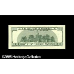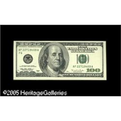 <B>Fr. 2175-F $100 1996 Federal Reserve Note. Choice Crisp Uncirculated.</B></I>The sheet was fed into the press improperly, resulting in the watermark being inverted and on the wrong side of the face, as is the imbedded security thread. Lot:15407