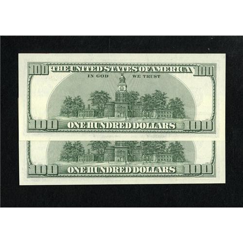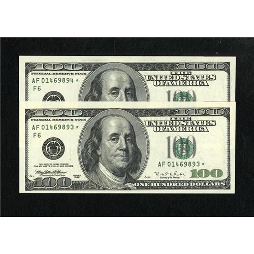 <B>Fr. 2175-F* $100 1996 Federal Reserve Notes. Two Consecutive Examples Choice Crisp Uncirculated.</B></I><BR>Only a tight bottom margin and some ATM ink along the top keep these beauties from a higher grade.<BR><BR><BR><b>Shipping:</b> Coins & Currency (<a target="_blank" href="http://www.heritageauctions.com/common/shipping.php">view shipping information</a>)