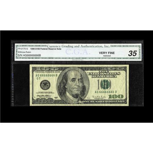 <B>Fr. 2175-G $100 1996 Federal Reserve Note. CGA Very Fine, restored.</B></I><BR>A solid serial 1996 $100 FRN, <B>AG66666666B.</B></I>