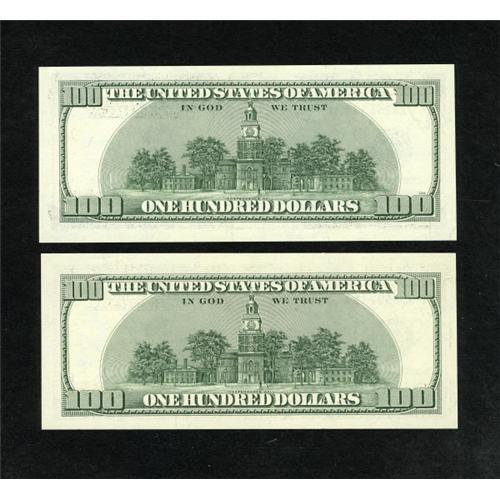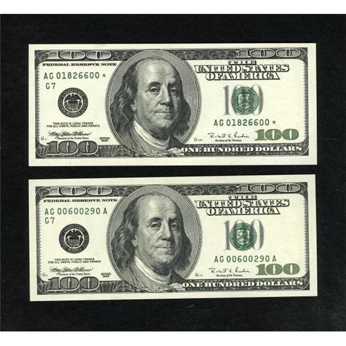 <B>Fr. 2175-G, G* $100 1996 Federal Reserve Notes. Two Examples Gem Crisp Uncirculated.</B></I><BR> A crackling fresh pair of Chicago "Big Head" notes with a regular and replacement issue represented..<BR><BR><b>Shipping:</b> Coins & Currency (<a target="_blank" href="http://www.heritageauctions.com/common/shipping.php">view shipping information</a>)