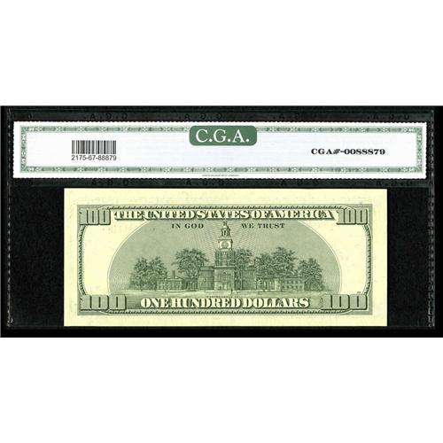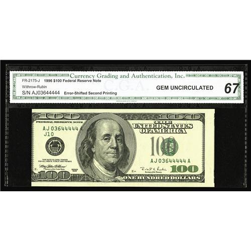 <B>Fr. 2175-J $100 1996 Federal Reserve Note. CGA Gem Uncirculated 67.</B></I><BR>This Benjamin's second printing was shifted to the left and as a result, part of the note next to it is showing. The first and third printing are perfectly aligned.