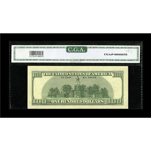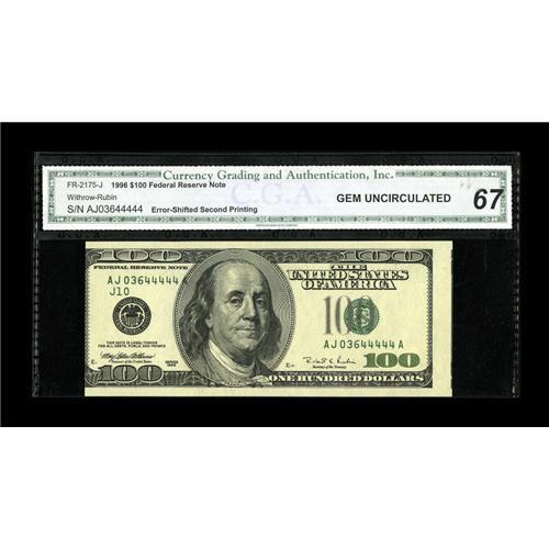 <B>Fr. 2175-J $100 1996 Federal Reserve Note. CGA Gem Uncirculated 67.</B></I><BR>The third printing is shifted enough to the right so that the suffix letter of the left serial number is on the portrait frame. Also, a sliver of the next note on the sheet shows at right.<BR><BR><b>Shipping:</b> Coins & Currency (<a target="_blank" href="http://www.heritageauctions.com/common/shipping.php">view shipping information</a>)