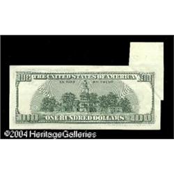 Fr. 2175-J $100 1996 Federal Reserve Note. Choice Cri <B>Fr. 2175-J $100 1996 Federal Reserve Note. Choice Crisp Uncirculated.</B></I> An interesting error, with this example displaying a large attached tab with a small unprinted area where it was folded. <BR><BR><B>Important notice:</B> Heritage usually auctions material at the rate of 200-250 lots per hour. On some occasions eBay Live bid software or the Internet may not be able to keep up with the pace of the auction. We recommend placing a realistic absentee bid now as insurance to avoid disappointment. Occasionally the auctioneer may eliminate or reject an eBay Live bid, and the auctioneer may also reopen a lot after the close of the eBay live bidding (usually because we missed an audience bid), and may reject your bid even if it shows you as the winning bidder. By bidding via eBay Live, you agree that Heritage may award the lot to another bidder at its sole discretion under the circumstances described above or any other reasonable circumstances. Since eBay bids are not shown to us until we open the lot on the floor, we treat those bids just like floor bids. In most cases the floor responds before the eBay bid is presented to us, due to Internet lag time, so for consistency we have made it a policy that floor bids are always considered first over tie eBay live bids. Also please note that all Heritage lots purchased through eBay Live carry a 20% Buyer's Premium. Please make sure you read the Terms and Conditions before you bid. This lot is being auctioned in conjunction with a live floor auction by Heritage Galleries & Auctioneers. All final auction and invoice information will be supplied by Heritage Galleries & Auctioneers, and all other information should be considered preliminary. Lot:16111