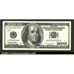 Fr. 2175-J $100 1996 Federal Reserve Note. Extremely Fine-About Uncirculated. There is a small but dark face on back offset.