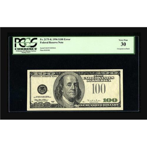 <B>Fr. 2175-K $100 1996 Federal Reserve Note. PCGS Very Fine 30.</B></I><BR>The green portion of the overprint appears on the back of this C-note.<BR><BR><b>Shipping:</b> Coin/Currency (<a target="_blank" href="http://www.heritageauctions.com/common/shipping.php">view shipping information</a>)
