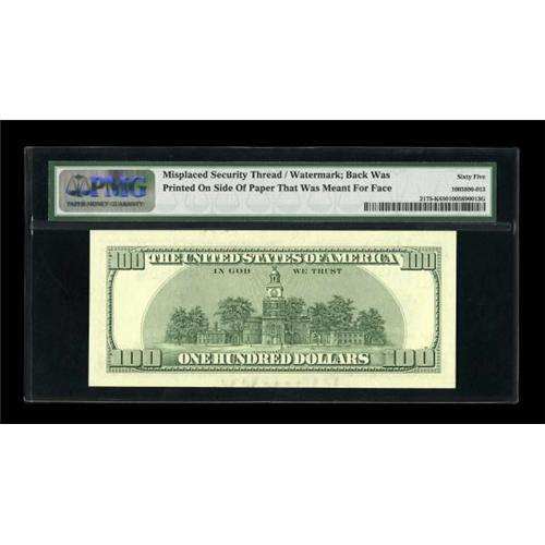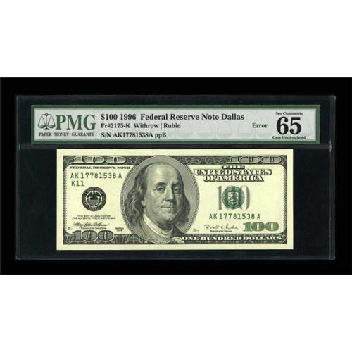 <B>Fr. 2175-K $100 1996 Federal Reserve Note. PMG Gem Uncirculated 65.</B></I><BR> Large margins are noticeable on this misplaced watermark example which it carries on the left side of the note versus the normal right side.<BR><BR><b>Shipping:</b> Coins & Currency (<a target="_blank" href="http://www.heritageauctions.com/common/shipping.php">view shipping information</a>)