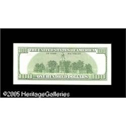 <B>Fr. 2175-L $100 1996 Federal Reserve Note. Extremely Fine.</B></I><BR>This new hundred is missing all the ink from the color shifting "100" at the lower right of the note, although the numerals are extremely heavily embossed. Lot:15148