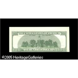 <B>Fr. 2175-L $100 1996 Federal Reserve Note. Gem New.</B></I><BR>Along with its inverted third print, this modern $100 has the centering and cutting defect that is associated with this error type. Lot:15134
