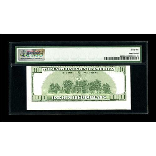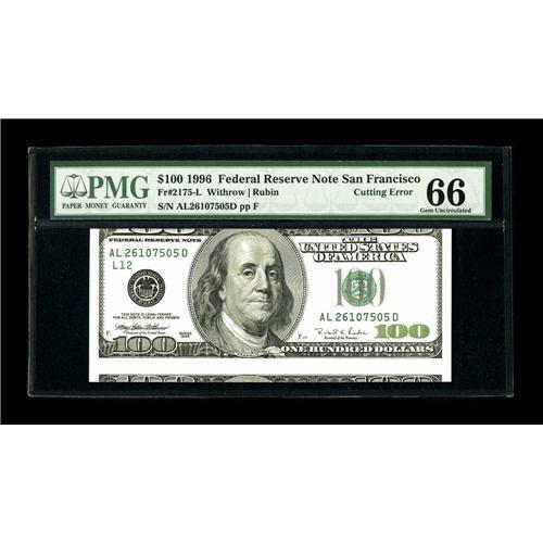<B>Fr. 2175-L $100 1996 Federal Reserve Note. PMG Gem Uncirculated 66.</B></I><BR>This neat "Cutting Error" affects both sides of this high denomination note.<BR><BR><b>Shipping:</b> Coin/Currency (<a target="_blank" href="http://www.heritageauctions.com/common/shipping.php">view shipping information</a>)