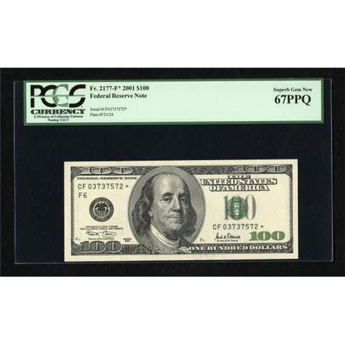 <B>Fr. 2177-F* $100 2001 Federal Reserve Note. PCGS Superb Gem New 67PPQ.</B></I><BR> Wonderful inks and behemoth grace this modern C-note replacement.<BR><BR><b>Shipping:</b> Coins & Currency (<a target="_blank" href="http://www.heritageauctions.com/common/shipping.php">view shipping information</a>)