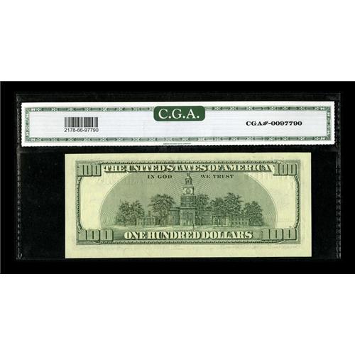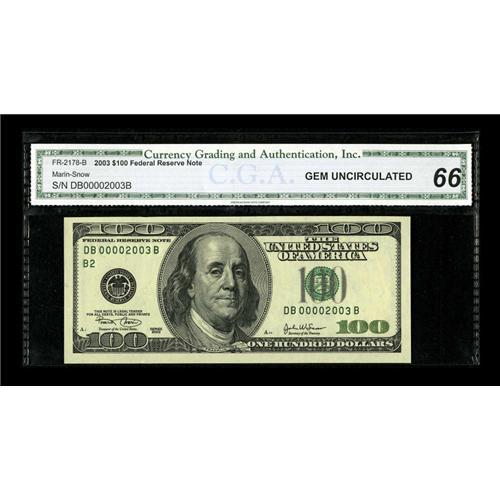 <B>Fr. 2178-B $100 2003 Federal Reserve Note. CGA Gem Uncirculated 66.</B></I><BR>Superb punch through embossing and bright colors are found on this unusual low serial number note DB00002003B, with the serial number and the series date a perfect match.<BR><BR><b>Shipping:</b> Coins & Currency (<a target="_blank" href="http://www.heritageauctions.com/common/shipping.php">view shipping information</a>)