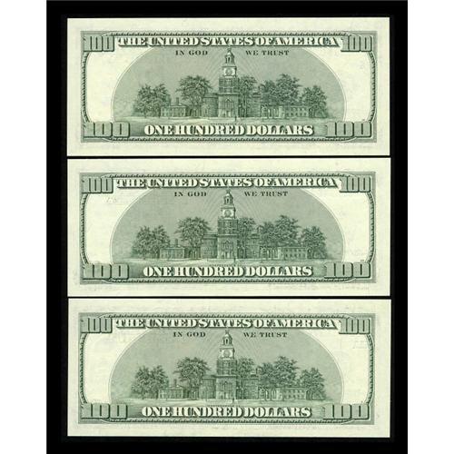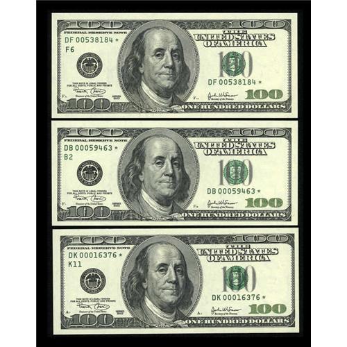 <B>Fr. 2178-B*; F*; K* $100 2003 Federal Reserve Notes. Gem Crisp Uncirculated.</B></I><BR> All three of these stars have wide margins and bold embossing.<BR><I>From The Thomas M. Flynn Collection</B></I><BR><BR><b>Shipping:</b> Coins & Currency (<a target="_blank" href="http://www.heritageauctions.com/common/shipping.php">view shipping information</a>)