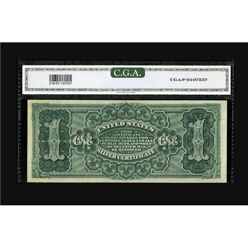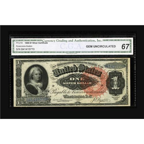 <B>Fr. 218 $1 1886 Silver Certificate CGA Gem Uncirculated 67.</B></I> This is a beautifully bright example of a large Red Seal Martha with the first back. Fr. 218 is the third scarcest of the seven 1886 Marthas. This one has bright color and broad margins.<BR><BR><b>Shipping:</b> Coin/Currency (<a target="_blank" href="http://www.heritageauctions.com/common/shipping.php">view shipping information</a>)