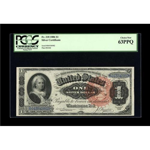 <B>Fr. 218 $1 1886 Silver Certificate PCGS Choice New 63PPQ.</B></I> The margins and front to back centering are clearly Gem. The margin at right though was cut a little unevenly.<BR><BR><b>Shipping:</b> Coin/Currency (<a target="_blank" href="http://www.heritageauctions.com/common/shipping.php">view shipping information</a>)