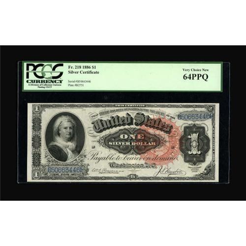 <B>Fr. 218 $1 1886 Silver Certificate PCGS Very Choice New 64PPQ.</B></I> A slightly larger top margin would have certainly resulted in a full Gem grade as three of the margins are behemoth in size.<BR><BR><b>Shipping:</b> Coins & Currency (<a target="_blank" href="http://www.heritageauctions.com/common/shipping.php">view shipping information</a>)
