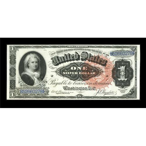 <B>Fr. 218 $1 1886 Silver Certificate Very Choice New.</B></I> The centering is almost perfect on this gorgeous Martha Washington note. The colors are bright and bold, and the overall aesthetic appearance is wonderful. This note will please even the most discriminating buyer. <BR><BR><b>Shipping:</b> Coins & Currency (<a target="_blank" href="http://www.heritageauctions.com/common/shipping.php">view shipping information</a>)