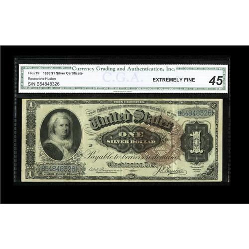 <B>Fr. 219 $1 1886 Silver Certificate CGA Extremely Fine 45.</B></I> The color on this note is most pleasing and we suspect this note spent very little time in circulation as the consecutive note to this one is also in this sale.
