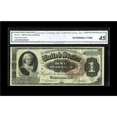 <B>Fr. 219 $1 1886 Silver Certificate CGA Extremely Fine 45.</B></I> The second in a pair of consecutive notes in this sale, this piece also boasts pleasing color and original surfaces.