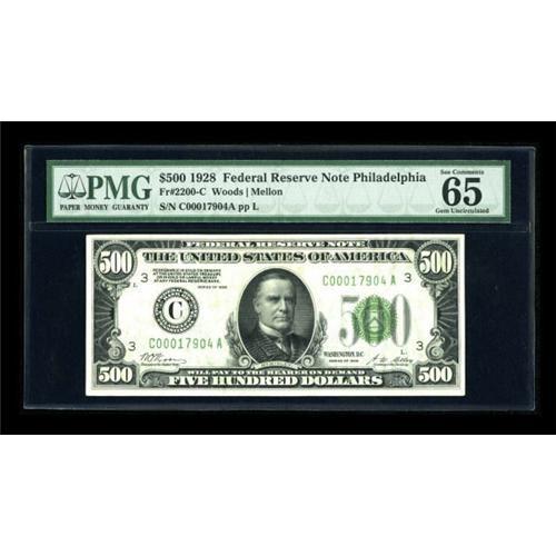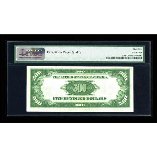 <B>Fr. 2200-C $500 1928 Federal Reserve Note. PMG Gem Uncirculated 65 EPQ.</B></I><BR> The details are as deeply printed as one could find on the series with bright white paper as its tapestry. A deep mint-green overprint adds to the overall eye appeal on this widely evenly margined issue.<BR><BR><b>Shipping:</b> Coins & Currency (<a target="_blank" href="http://www.heritageauctions.com/common/shipping.php">view shipping information</a>)