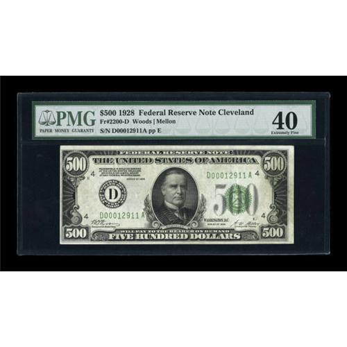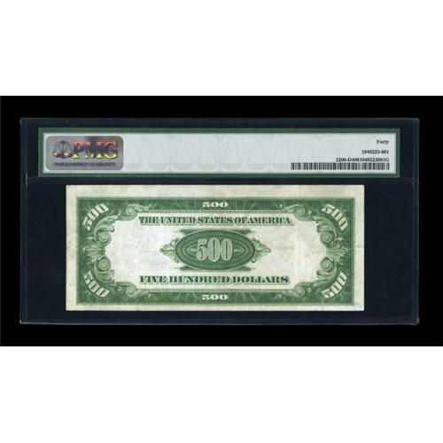 <B>Fr. 2200-D $500 1928 Federal Reserve Note. PMG Extremely Fine 40.</B></I><BR> A few light folds account for the grade on this bright and deeply printed $500.<BR><BR><b>Shipping:</b> Coins & Currency (<a target="_blank" href="http://www.heritageauctions.com/common/shipping.php">view shipping information</a>)