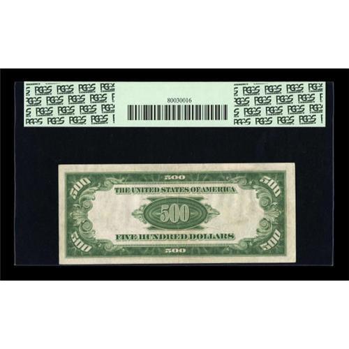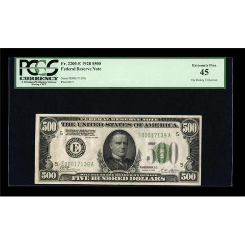 <B>Fr. 2200-E $500 1928 Federal Reserve Note. PCGS Extremely Fine 45.</B></I><BR> The paper remains bright on this pleasing early small Fed from the Richmond district.<BR><BR><b>Shipping:</b> Coins & Currency (<a target="_blank" href="http://www.heritageauctions.com/common/shipping.php">view shipping information</a>)