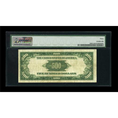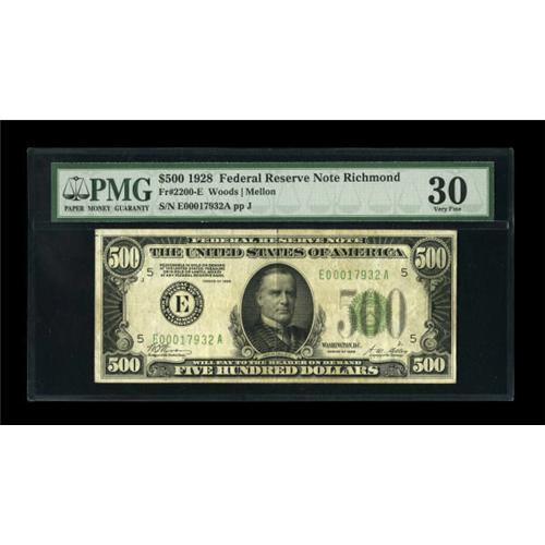 <B>Fr. 2200-E $500 1928 Federal Reserve Note. PMG Very Fine 30.</B></I><BR> Solid paper is noted on this evenly circulated and problem free issue.<BR><BR><b>Shipping:</b> Coins & Currency (<a target="_blank" href="http://www.heritageauctions.com/common/shipping.php">view shipping information</a>)