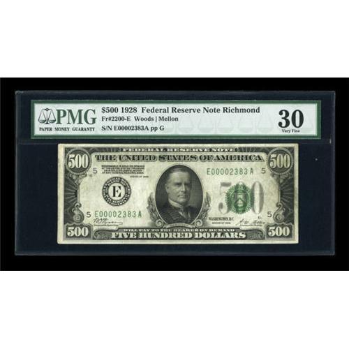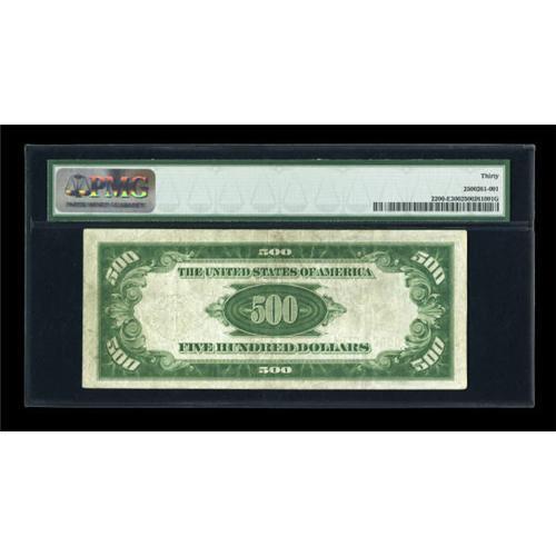 <B>Fr. 2200-E $500 1928 Federal Reserve Note. PMG Very Fine 30.</B></I><BR> Series 1928 High Denoms have consistently commanded premiums. This piece is deeply printed and problem free save for a few pinholes.<BR><BR><b>Shipping:</b> Coins & Currency (<a target="_blank" href="http://www.heritageauctions.com/common/shipping.php">view shipping information</a>)