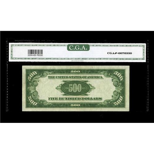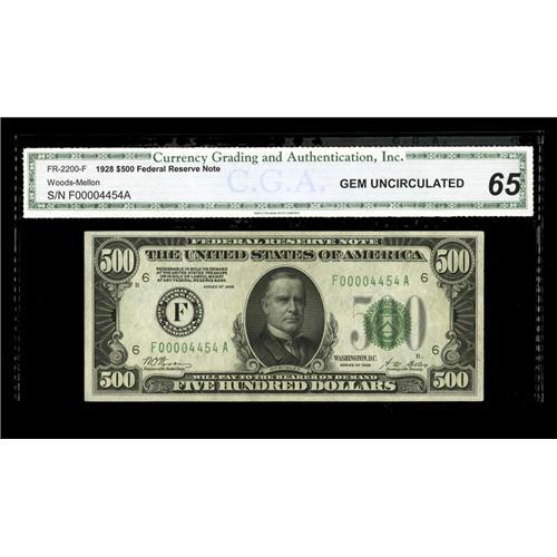 <B>Fr. 2200-F $500 1928 Federal Reserve Note. CGA Gem Uncirculated 65.</B></I><BR>This CGA certified Gem Uncirculated 65 example is one of the few Atlanta district pieces we've ever handled in this state of preservation from the much in demand 1928 series.