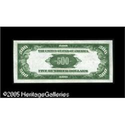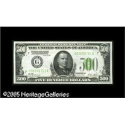 <B>Fr. 2200-G $500 1928 Federal Reserve Note. About Uncirculated.</B></I><BR>The Light Green Seal variety, although LGS notes are not listed in the Oakes reference. This is an attractive piece with a number of as-made creases as well as a light centerfold. Lot:16482
